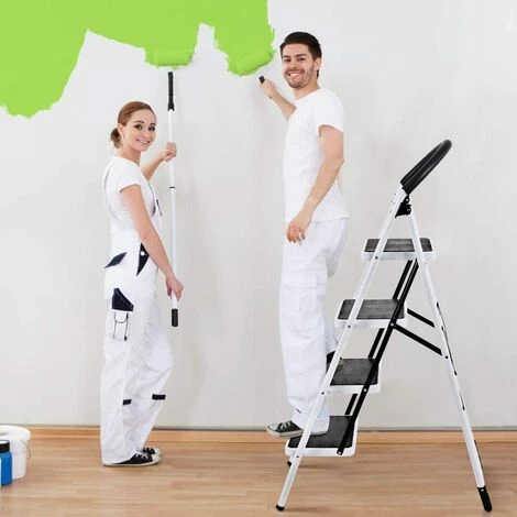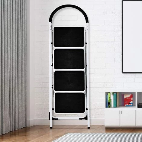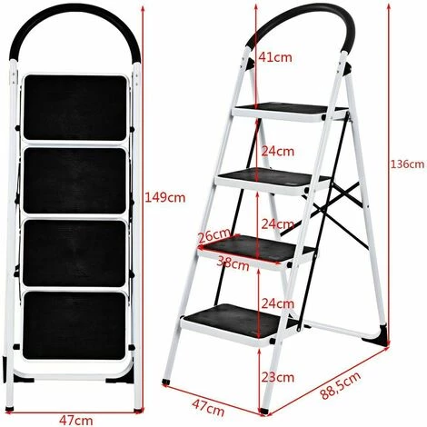 Verwenden Sie diese Stufen-Leiter für einfaches und sicheres Arbeiten in höhergelegenen Bereichen. Sie besteht aus hochwertigem Eisenmaterial und besitzt eine maximale Tragekapazität von 150 kg. Die extra breiten Trittflächen sind mit einer Gummibeschichtung überzogen, für mehr Sicherheit durch höhere Haftung. Dabei befinden sich Gummipolster unter den Stützen, für zusätzliche Stabilität, selbst bei unebenen Oberflächen. Dank seines simplen Klappdesigns lässt sich die Leiter problemlos zusammenfalten und ebenso bequem und unkompliziert transportieren und verstauen.