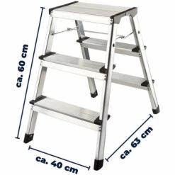 Details 2-Stufen-Leiter: Eingeklappt (LxBxH): 7.0 x 47.5 x 98.0 cm, Ausgeklappt (LxBxH): 49.0 x 47.5 x 90.0 cm, Gewicht: 4.5 Kg, Max Arbeitshöhe: 248.0 cm