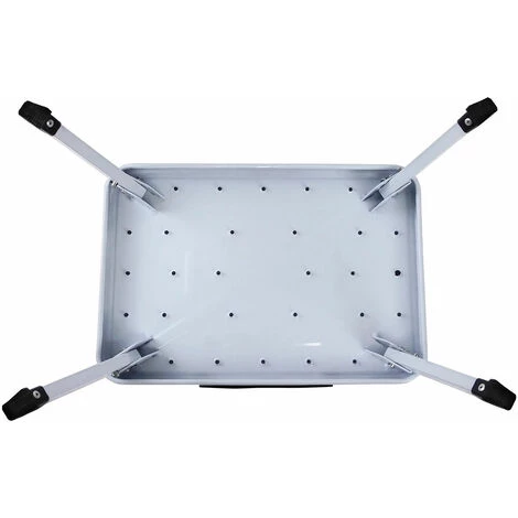 Maße: 48 x 30 cm (L/B) und ausgeklappt 18 cm hoch. Zusammengeklappt nur vier bis fünf cm hoch.