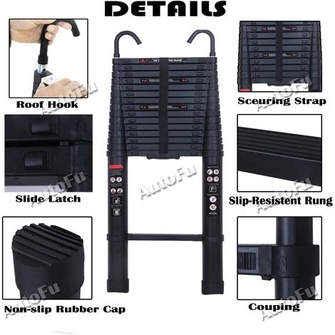 Unsere 6,2 m lange Verlängerungsleiter mit abnehmbarem Haken ist aus hochwertigem Aluminiummaterial gefertigt, stabil und sicher, 15 Teleskopstufen können bei vollständiger Entfaltung auf 6,2 m ausgezogen werden, eine ideale zusammenklappbare und tragbare Teleskopleiter.