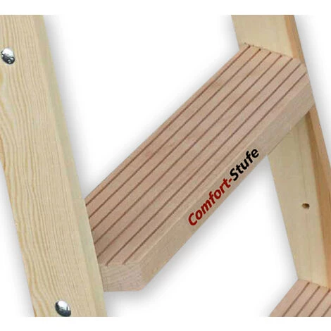 Die Holz-Comfort-Stufenstehleiter ermöglicht durch die 80 mm Comfort-Stufen auch bei bei längerem Einsatz einen bequemen Stand. Stufen statt Sprossen: So lautet die Empfehlung, wenn Leitern nicht nur zum Aufstieg, sondern auch als Arbeitsplatz genutzt werden.