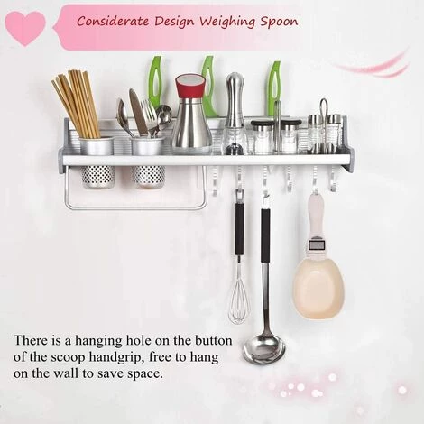 DAS DESIGN BERÜCKSICHTIGT ♥ Der elektronische Wiegelöffel mit klarem LCD-Display, leicht ablesbar und bequem zu bedienen. Am Knopf des Schaufelgriffs befindet sich ein Loch zum Aufhängen, das platzsparend an der Wand aufgehängt werden kann.