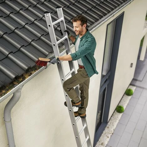 Diese leichte Außenleiter aus Aluminium für Haus, Garten und Gewerbe macht sich jahrelang bezahlt. Sie ist mühelos aufzustellen und einfach zu transportieren. Auch Regen kann ihr nichts anhaben, denn das Material ist garantiert witterungsbeständig. Wenn Sie trotz Regen weiterarbeiten müssen, bietet Ihnen die Leiter bestmögliche Sicherheit: Die Sprossen sind rutschsicher geriffelt und die Füße haben eine rutschfeste Flächenauflage.