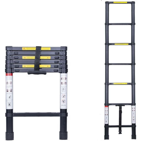 –Die Teleskopleiter kann problemlos von 67 cm auf 200 cm ausgezogen werden. 6 Sprossen.