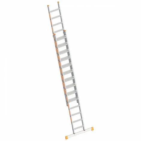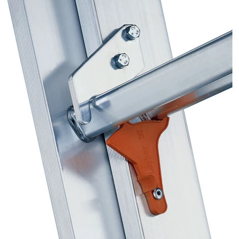 Jede der vier Leiterngrößen besitzt gemäß DIN EN 131-1 eine Traverse mit der Breite 1130 mm. Im eingefahrenen Zustand bietet die Leiter durch die hintereinander liegenden 80 mm breiten Stufen einen guten und komfortablen Stand, fast wie auf einem Podest. Die Einhängehaken aus Aluminium und die Sicherheitsklappe aus Kunststoff garantieren eine einfache und sichere Nutzung der Leiter. Die Beschläge aus Aluminium gewährleisten eine reibungslose Führung bei den Leitern.