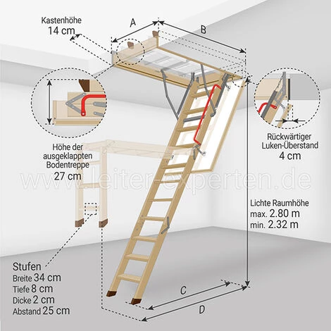 – Die Dachbodenleiter kann durch absägen der Holme an Ihre Raumhöhe angepasst werden.