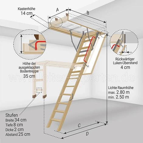 – Die Dachbodenleiter kann durch absägen der Holme an Ihre Raumhöhe angepasst werden.
