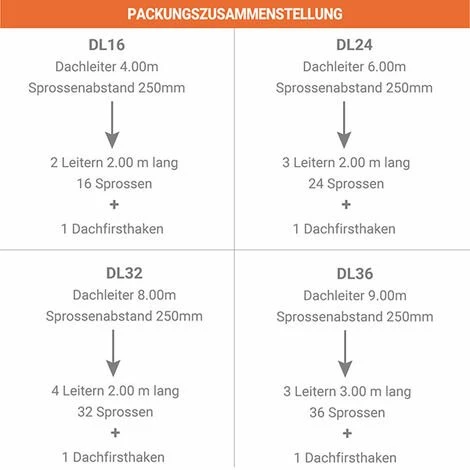 – DL32 Dachleiter 8.00m : 4 Leiter 2.00m + 1 Firstbügel.
