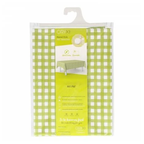 – Mantel Hule estampado en color lima con cuadrados blancos. Diseño moderno y elegante para cualquier ocasión.