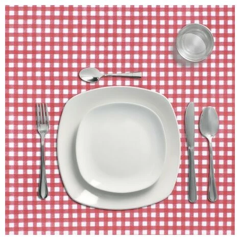 – Mantel Hule estampado en color blanco con formas cuadradas en rojo. Diseño moderno y elegante para cualquier ocasión.