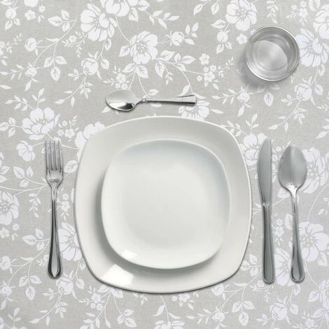 – Tischdecke aus Gummi in Grau bedruckt mit weißen Blumenformen. Modernes und elegantes Design für jeden Anlass.