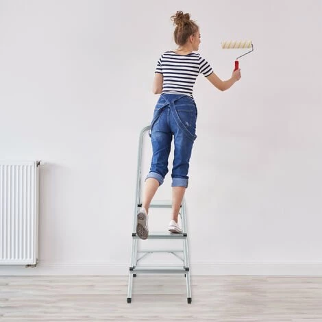 Eine Leiter im Haushalt ist zu jeder Zeit ein hilfreicher Begleiter: Ob beim Anbringen von Lampen, Streichen der Wände oder um an das obersten Regal heran zu kommen. Dank geriffelter Stufen und praktischem Haltebügels wahrst Du dabei stets die Balance und kannst sicher auf der Trittleiter hinauf steigen. Kratzer im Untergrund verhindern die Bodenschoner aus Kunststoff. Wird die Stehleiter nicht benötigt, kannst Du sie einfach zusammenklappen und dank ihres Materials auch leicht transportieren.