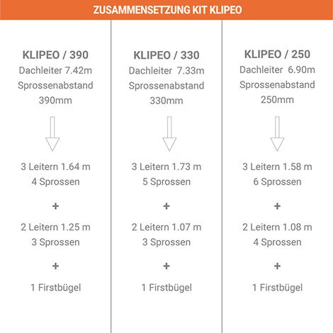 – Besteht aus 3 Leiterteilen mit 4, 5 oder 6 Sprossen + 2 Leiterteilen mit 3 oder 4 Sprossen je nach gewähltem Sprossenabstand.