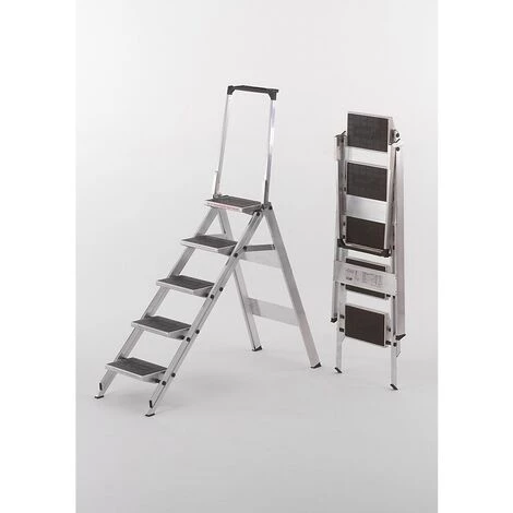 Die WAKÜ Little Jumbo Sicherheitstreppe / Klapptritt mit 5 Stufen Kunststoffbelag (mit Bügel) überzeugt durch ihre hochwertige und äußerst stabile Konstruktion, die ihr in der Ausgabe 2/2010 der Stiftung Warentest die Note 1,7 (Gut) eingebracht hat. Mit 2 Handgriffen ist die WAKÜ Treppe zusammenklappbar und somit äußerst leicht transportier- und verstaubar.