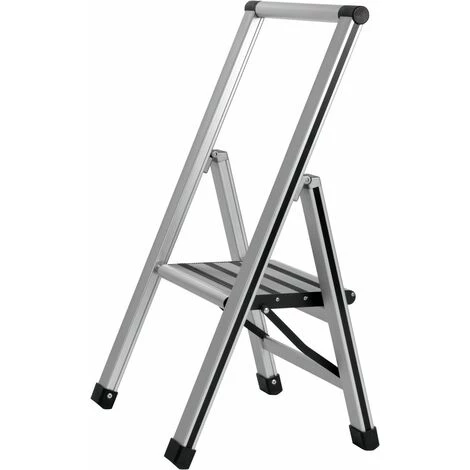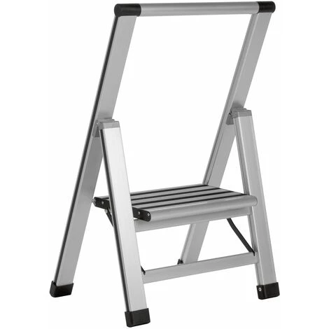 Die Alu – Design Trittleiter mit einer Stufe von WENKO sorgt für sicheren Halt bei Arbeiten, die in die Höhe gehen. Egal ob beim Gardinen aufhängen, Fenster putzen oder der Gartenarbeit, die innovative Leiter verspricht eine optimale Standsicherheit bei einer Standhöhe von 25 cm – kein unsicheres Balancieren und Wackeln mehr. Der zusätzliche Sicherheits – Haltebügel bietet stabilen Halt. Hier ist zeitlos schönes Design kombiniert mit einem Höchstmaß an Sicherheit. Ein komfortables Auf – und Absteigen ist durch die rutschsichere (geriffelte und gummierte) XXL – Stufe (Standfläche 31,5 cm x 23 cm) ebenso gewährleistet wie ein ermüdungsfreies Stehen, selbst nach längerer Standzeit. Die moderne, zuverlässige Leiter ist aus hochwertigem, robustem Aluminium und rutschsicheren Kunststoffkappen hergestellt. Bei Nichtgebrauch lässt sich diese Leiter ultraflach zusammenklappen, ideal für platzsparendes Verstauen. Ausgeklappt hat die Leiter ein Maß von (B x H x T): 44 x 69 x 33 cm. Ultraflach