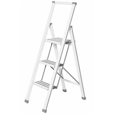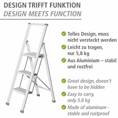 Für alle Arbeiten, die in die Höhe gehen, sorgt die 3-stufige Alu-Design Trittleiter von WENKO für sicheren Halt. Egal ob beim Bilder und Gardinen aufhängen, Fenster putzen oder der Gartenarbeit, die innovative Leiter verspricht eine optimale Standsicherheit bei einer Standhöhe von 75 cm – kein unsicheres Balancieren und Wackeln mehr. Der zusätzliche Sicherheits-Haltebügel bietet stabilen Halt. Hier ist zeitlos schönes Design kombiniert mit einem Höchstmaß an Sicherheit. Ein komfortables Auf- und Absteigen ist durch die rutschsicheren (geriffelte und gummierte) XXL-Stufen (Standfläche 31,5 cm x 23 cm, Trittstufen 31,5 cm x 14,5 cm) ebenso garantiert wie ein ermüdungsfreies Stehen, selbst nach längerer Standzeit. Die zuverlässige Leiter ist aus rostfreiem, beschichtetem Aluminium und rutschsicheren Kunststoffkappen gefertigt. Die hochwertige Klappleiter trägt eine Last bis 150 kg. Bei Nichtgebrauch lässt sich diese Leiter ultraflach zusammenklappen, ideal für platzsparendes Verstauen. Durch das hochwertige Aluminium ist der Klapptritt mit nur ca. 6 kg komfortabel leicht. Ausgeklappt hat die Leiter ein Maß von (B x H x T): 44 x 119 x 69 cm. Abhängig von der Körpergröße kann eine Arbeitshöhe von ca. 255 cm erreicht werden. Auf dieses Produkt haben Sie 10 Jahre Garantie ab Kaufdatum. Die Garantie umfasst alle Material- und Herstellungsfehler, welche die Funktion beeinträchtigen. Ausgenommen sind Schäden, die durch unsachgemäße Handhabung oder natürlichen Verschleiß entstehen. Diese Garantie schränkt Ihre gesetzlichen Gewährleistungsrechte nicht ein. ImMaße (B x H x T): 44 x 127 x 5.5 cm
