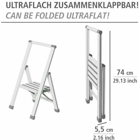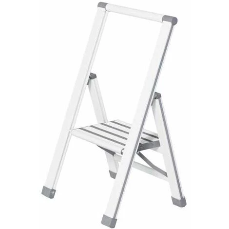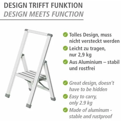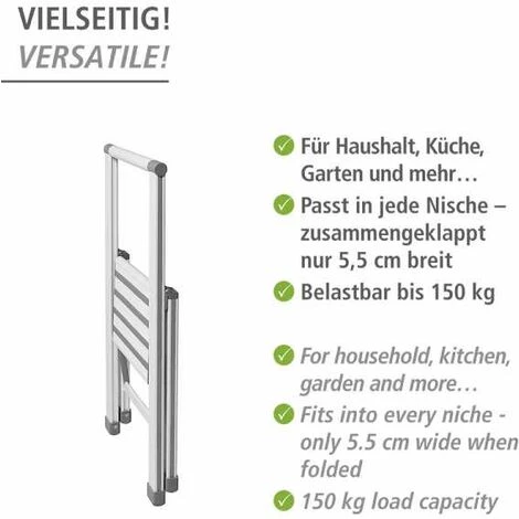 Die Alu-Design Trittleiter mit einer Stufe von WENKO sorgt für sicheren Halt bei Arbeiten, die in die Höhe gehen. Egal ob beim Gardinen aufhängen, Fenster putzen oder der Gartenarbeit, die zuverlässige Leiter verspricht eine optimale Standsicherheit bei einer Standhöhe von 25 cm – kein unsicheres Balancieren und Wackeln mehr. Der zusätzliche Sicherheits-Haltebügel bietet stabilen Halt. Hier ist zeitlos schönes Design kombiniert mit einem Höchstmaß an Sicherheit. Ein komfortables Auf- und Absteigen ist durch die rutschsichere (geriffelte und gummierte) XXL-Stufe (Standfläche 31,5 cm x 23 cm) ebenso garantiert wie ein ermüdungsfreies Stehen, selbst nach längerer Standzeit. Die hochwertige Leiter ist aus rostfreiem, beschichtetem Aluminium und rutschsicheren Kunststoffkappen gefertigt. Die clevere Klappleiter trägt eine Last bis 150 kg. Bei Nichtgebrauch lässt sich diese Leiter ultraflach zusammenklappen, ideal für platzsparendes Verstauen. Durch das hochwertige Aluminium ist der Klapptritt mit nur ca. 3 kg komfortabel leicht. Ausgeklappt hat die Leiter ein Maß von (B x H x T): 44 x 69 x 33 cm. Abhängig von der Körpergröße kann eine Arbeitshöhe von ca. 205 cm erreicht werden. Auf dieses Produkt haben Sie 10 Jahre Garantie ab Kaufdatum. Die Garantie umfasst alle Material- und Herstellungsfehler, welche die Funktion beeinträchtigen. Ausgenommen sind Schäden, die durch unsachgemäße Handhabung oder natürlichen Verschleiß entstehen. Diese Garantie schränkt Ihre gesetzlichen Gewährleistungsrechte nicht ein. ImMaße (B x H x T): 44 x 74 x 5.5 cm