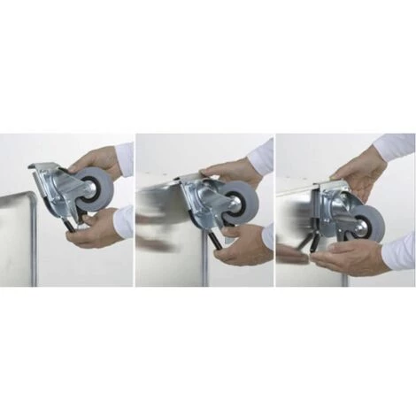 - •Mobilität für sämtliche Kisten ab einer Größe von 550 mm × 350 mm Innenmaß.•Werkzeuglose Montage möglich.•Aus Vollgummi. Ø 100 mm. Lenkrollen ausgestattet mit Radfeststeller.•Tragkraft bis 100 kg bei 4 Rollen.•Anordnungsempfehlungen: 2 Lenkrollen und 2 Bockrollen oder 4 Lenkrollen2 Lenkrollen. jeweils mit Klemmmechanismus 1 x links und 1 x rechts