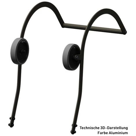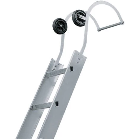 Stahlbügel, verzinkt, mit 2 Laufrädern. Die Dachleiter wird mit dem montierten Firsthaken auf der Dachfläche zum First gerollt, dort umgedreht und am First eingehängt.
