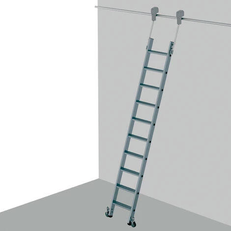 - Im Ruhezustand kann die Leiter platzsparend an das Regal gestellt werden